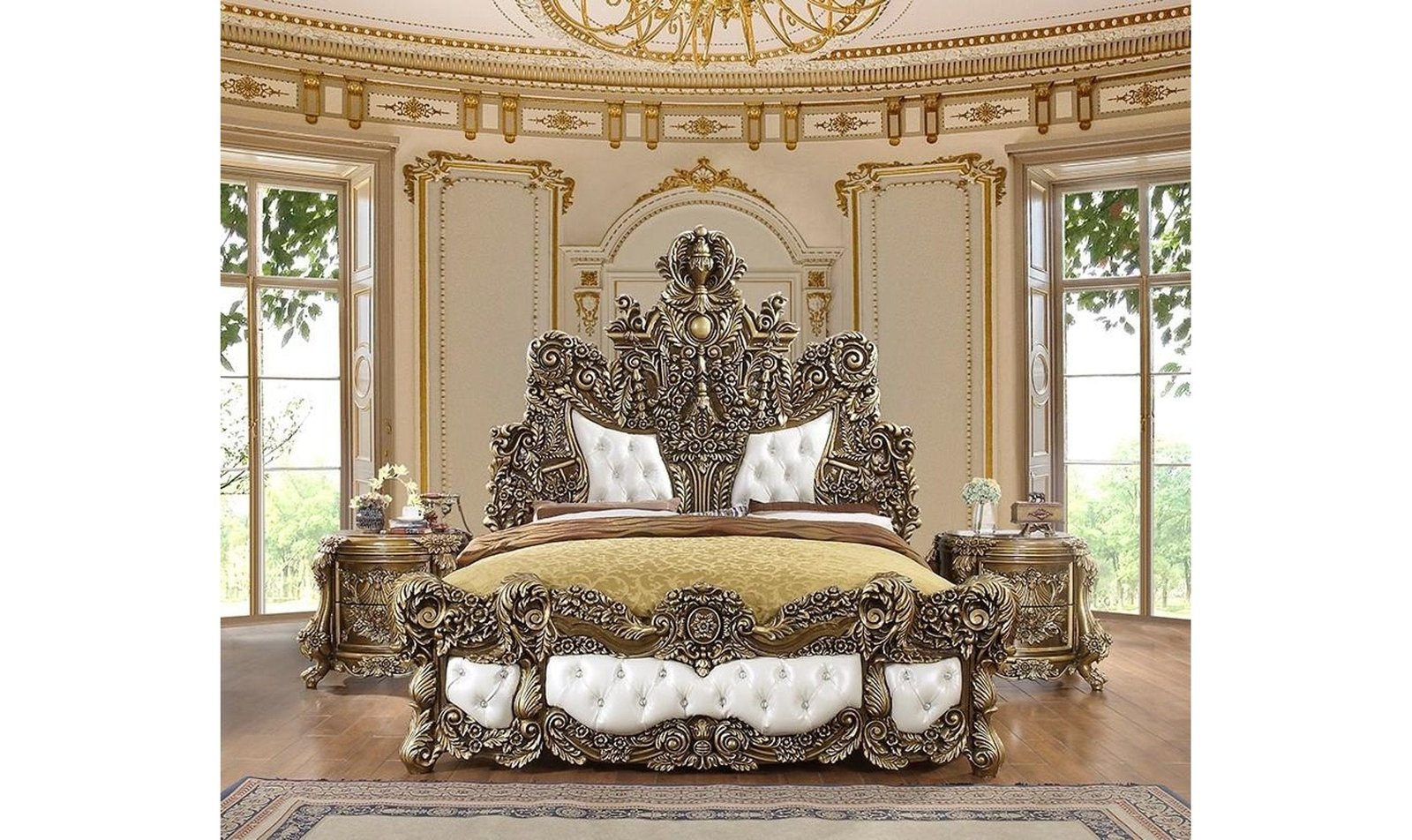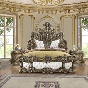 Transform your bedroom into a glamorous boudoir with a designer HD-1802 Bedroom Set from Homey Design. Our luxury bedroom Collection draws on influences from Old World, renowned for sophistication, glamour and spectacular luxury. The Luxury Ornate Old World Golden Curved Leaf Bed offering a sophisticated timeless focus, with unrivalled charm and grace. Simply stunning. Superb dreamlike in style, instantly transforming bedroom interiors. A contemporary structure with the illusion of movement, a true statement in the fluidity of its design. Part of a truly fabulous bedroom collection, offers you to sleep like a royalty and enjoy your leisure each night. This traditional collection reflects highly decorative details. These case goods boast a warm, perfect brown finish and gold decorative carvings combines with shaped fronts and tops to create a truly grand presentation. The case goods are distinguished by luxurious floral and rope carvings and a timeless Antique finish. This collection will be the showpiece of your home environment.
